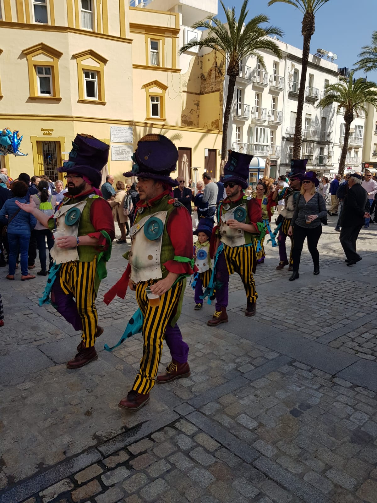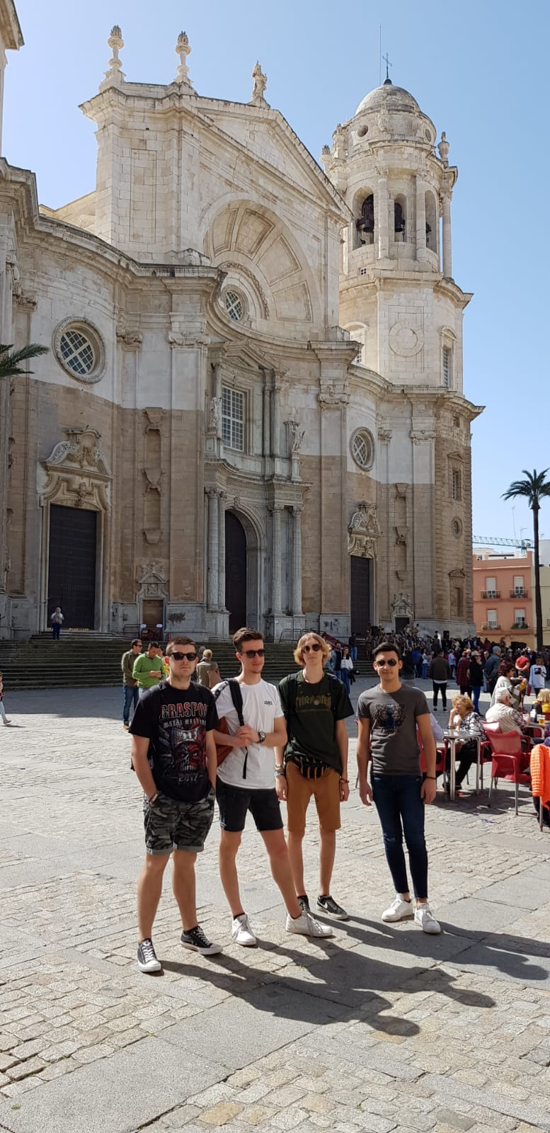 We zijn vanaf de dijk richting de kathedraal van Cadiz gewandeld, waar daar een groot feest nog aan de gang was genaamd Carnaval. Maar we kennen wel Carnaval zoals in België en Nederland wordt gevierd, maar hier wordt het heel anders gevierd. Hier gaan ze de straat op met hun kostuums die ze hebben gemaakt zelf. En gaan ze in groepen Spaanse liedjes zingen, waar dan een heel grote groep mensen rond gaat staan om te luisteren naar de liedjes die de groep zingt. Deze feest wordt in Spanje zelf een 3 weken gevierd.
